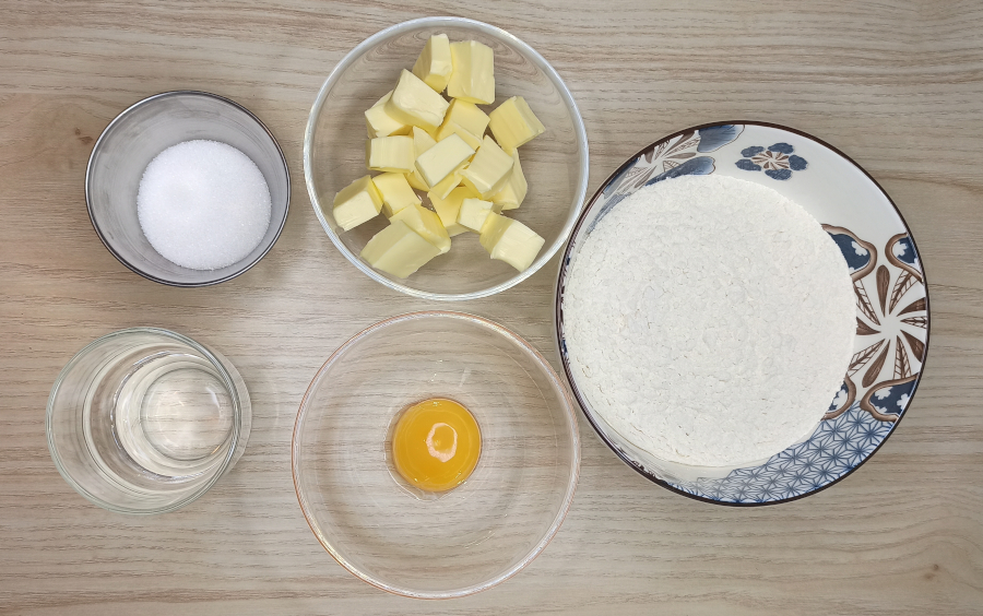Mélanger la farine et le sucre dans un saladier. Ajouter l’œuf et le beurre. Malaxer avec les mains de sorte à mélanger un peu les ingrédients. Ajouter l’eau. Malaxer jusqu’à obtenir une boule de pâte. La quantité d’eau peut varier légèrement suivant l’humidité ambiante. S’il y a trop d’eau rajouter un tout petit peu de farine. Sur un plan de travail enfariné étaler la pâte, puis garnir les moules. Piquer la pâte dans le fond de chaque moule à quelques endroits à l’aide d’une fourchette (pour éviter que la pâte ne gonfle à la cuisson). La quantité de pâte permet de faire environ 12 tartelettes.